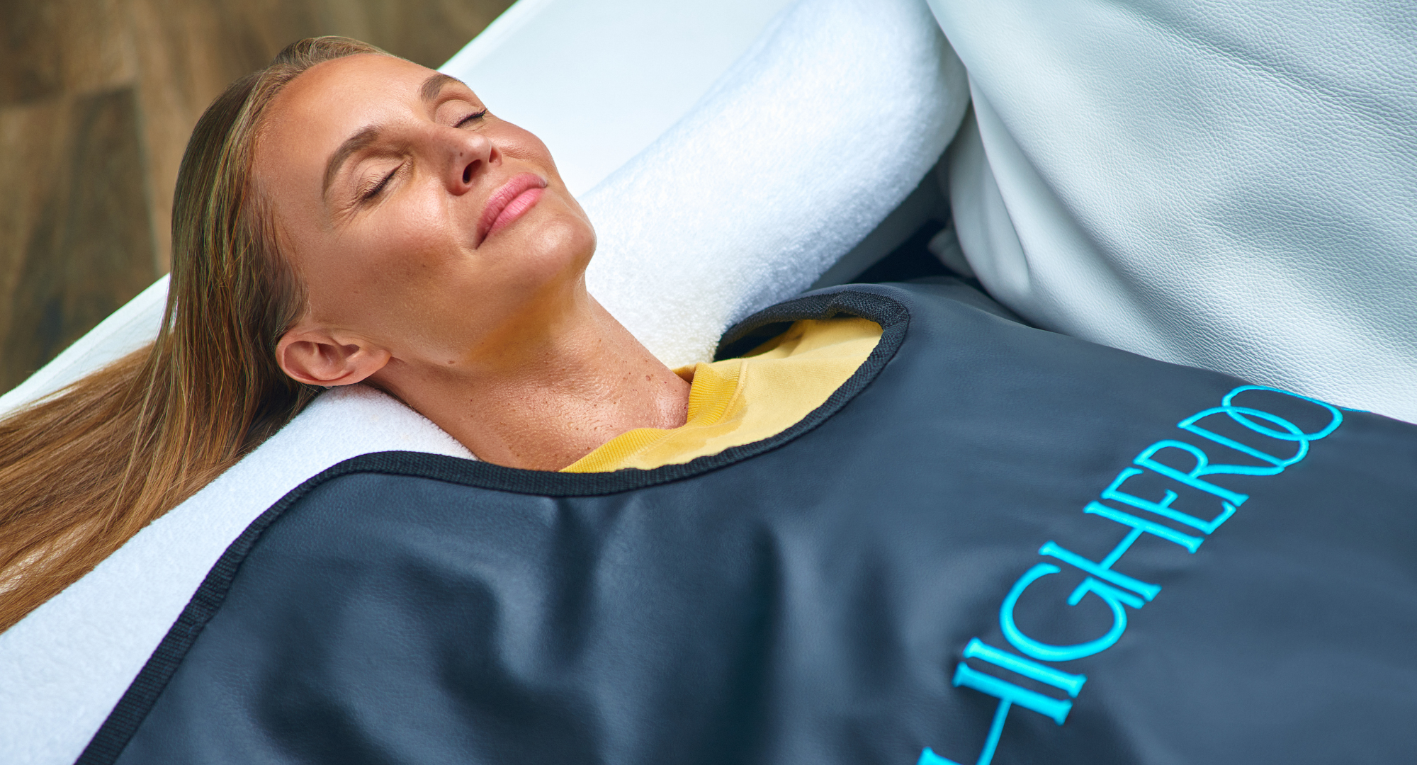 - Jei terapijos metu nenorite likti be drabužių, rekomenduojame kartu naudoti HigherDose kūno saunos rankšluostį. Jei jo neturite, būtinai dėvėkite kelnes, palaidinę ilgomis rankovėmis ir kojines.