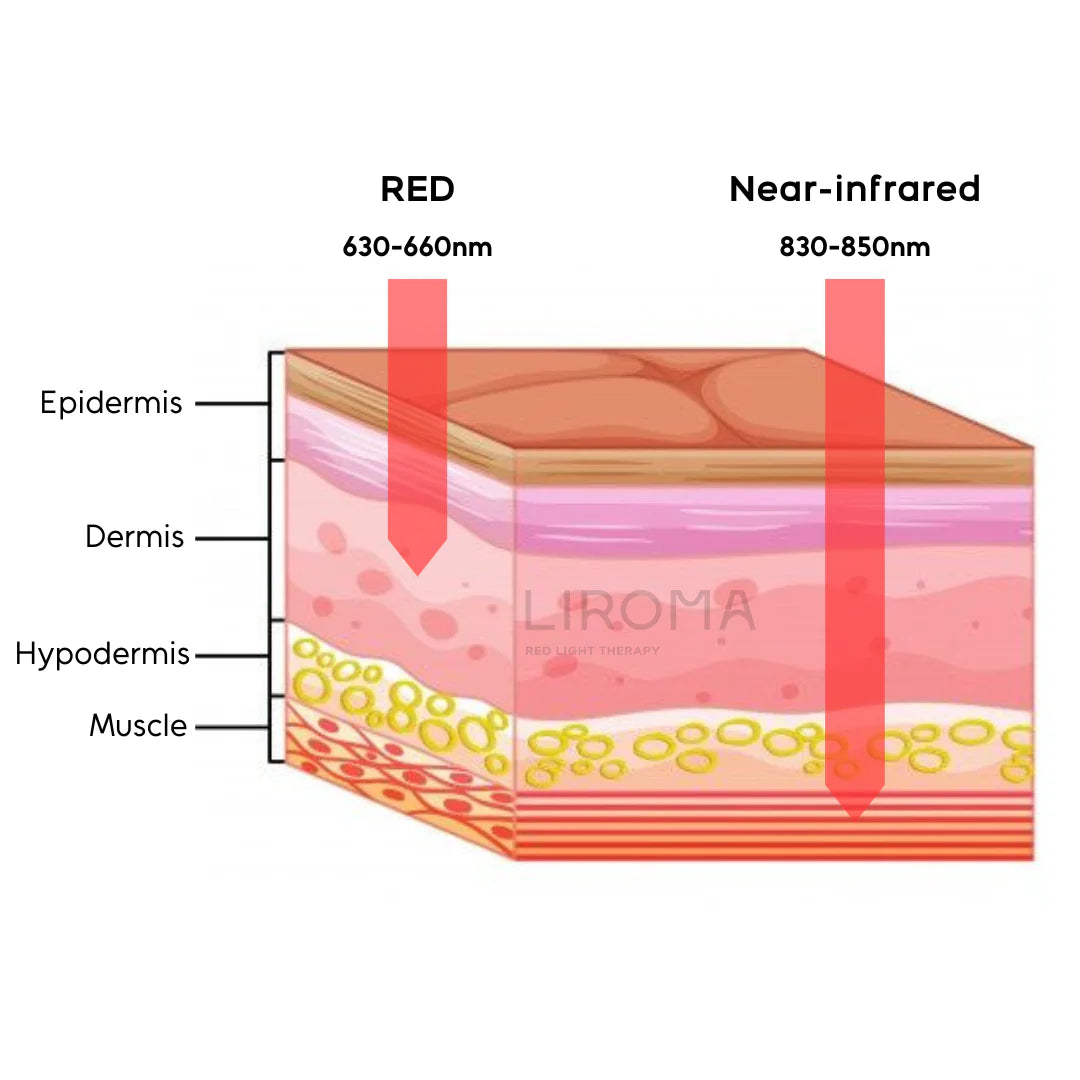 - Near infrared light (850 nm) penetrates the deepest layers of the skin, reduces inflammation and promotes cell regeneration.